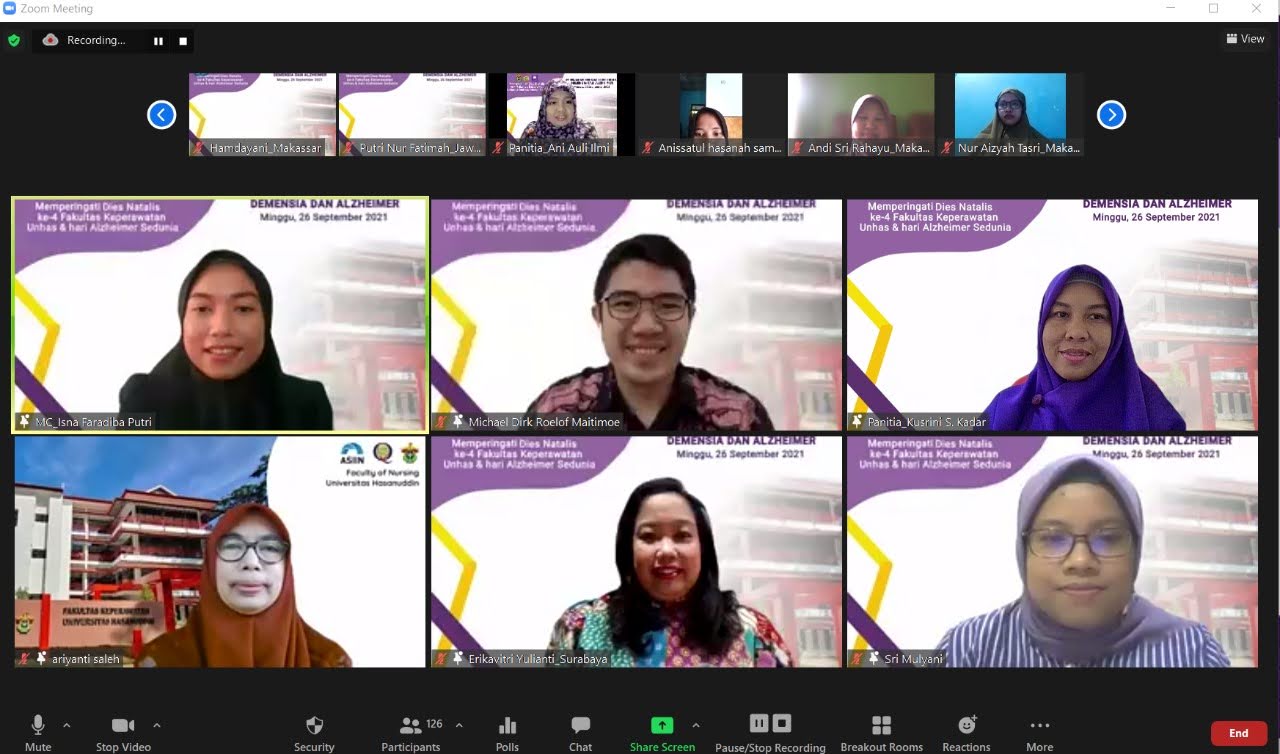Pada hari Minggu, 26-9-2021 telah dilaksankan Webinar Kesehatan dengan Tema “Mengenal Lebih Dekat Demensia dan Alzheimer” yang diselenggarakan secara daring (Online Zoom Meeting) sebagai rangkaian Dies Natalis FKep…