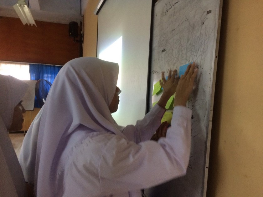 The material “English is Fun” helps in finding what are the obstacles in developing English, what factors encourage us so that students want to learn English, the method used is to appoint students to express their opinions about obstacles through sticky notes.