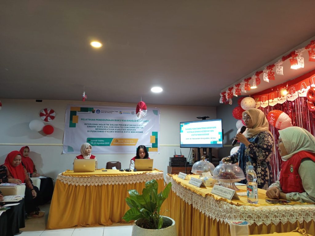 The UNHAS Faculty of Nursing Community Service Team held a socialization and training session on the use of the KIA Handbook for Young Babies, targeting midwives and health workers at the Kaluku Bodoa Community Health Center in Makassar City on Friday and Saturday (August 22-23) in the Kaluku Bodoa Community Health Center Hall. Also in attendance were the Head of the Makassar City Health Office (Dr. Nursaidah Sirajuddin, M.Kes), the Head of the Kaluku Bodoa Community Health Center (Dr. Rudi Lautan), and midwives and health workers at the Kaluku Bodoa Community Health Center.