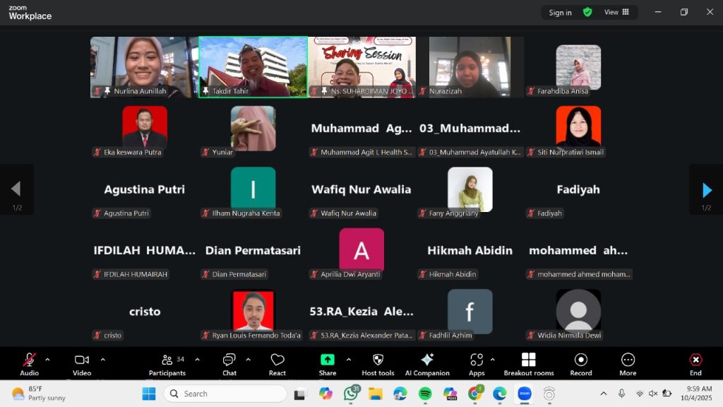 F.Kep Unhas gelar Sharing Session dengan tema “Your Nursing Journey to Japan Starts Here” pada Sabtu, 04 Oktober, menghadirkan Alumni (Ns. Suhardiman Joyo Negoro, S.Kep) yang saat ini berkarir sebagai Perawat di Jepang dan Mahasiswa Magister F.Kep Unhas diikuti oleh 50 peserta terditi dari Mahasiswa dan Alumni melalui Zoom Meeting.