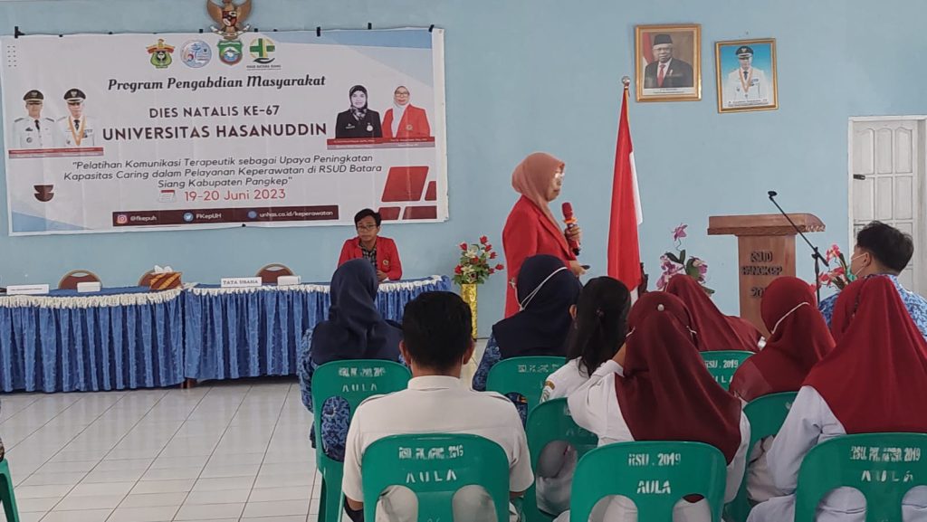 Program Pengabdian Kepada Masyarakat (Pengabmas) ini merupakan salah satu kegiatan pengabdian masyarakat yang mendapatkan pendanaan dari hibah Program PkM-Program Kemitraan Universitas Hasanuddin tahun 2023 dan merupakan rangkaian dari Dies Natalis ke-67 Universitas Hasanuddin. Tim Pengabmas ini diketuai oleh Dekan Fakultas Keperawatan Universitas Hasanuddin, Prof. Dr. Ariyanti Saleh, S.Kp.,M.Si, yang sekaligus sebagai pemateri pada kegiatan ini. Tim Pengabmas ini beranggotakan; Nurlaila Fitriani, S.Kep.,Ns.,M.Kep.,Sp.Kep.J, Framita Rahman, S.Kep.,Ns.,MSc dari Fakultas Keperawatan dan berkolaborasi dengan Nur Syamsu Ismali, S.Psi.,M.Si dari Fakultas Kedokteran serta beberapa mahasiswa. Tema dari kegiatan Pengabmas ini adalah “Pelatihan Komunikasi Terapeutik dalam Upaya Meningkatkan Kapasitas Caring Perawat dalam Pelayanan Keperawatan di RSUD Batara Siang, Kabupaten Pangkep”. Kegiatan ini berlangsung di aula RSUD Batara Siang selama 2 hari yakni Senin-Selasa, 19-20 Juni 2023.
